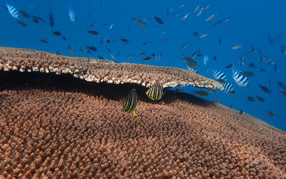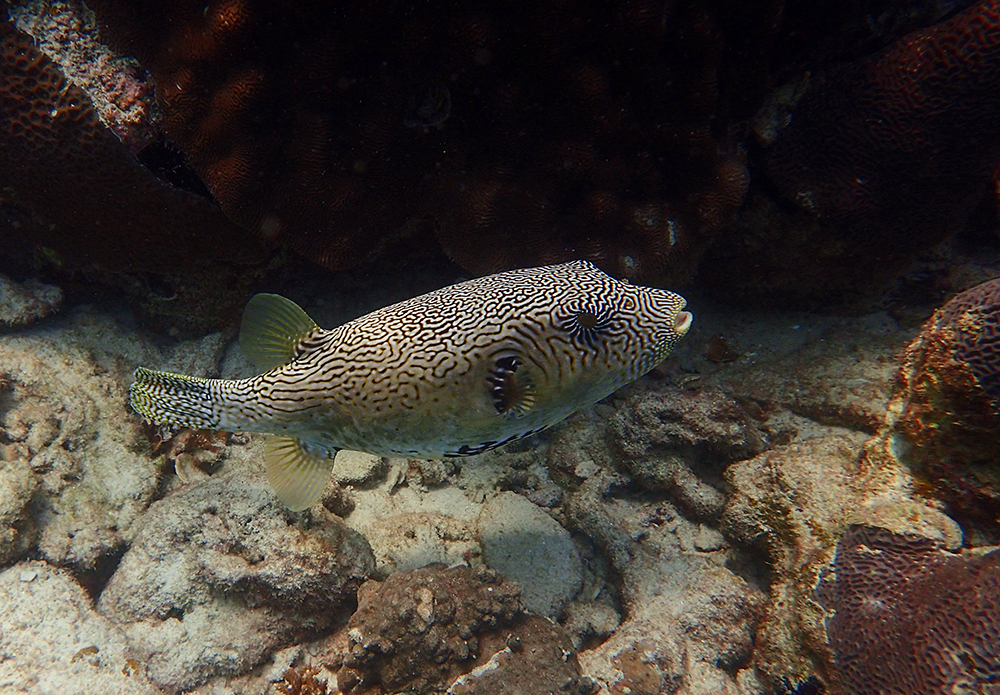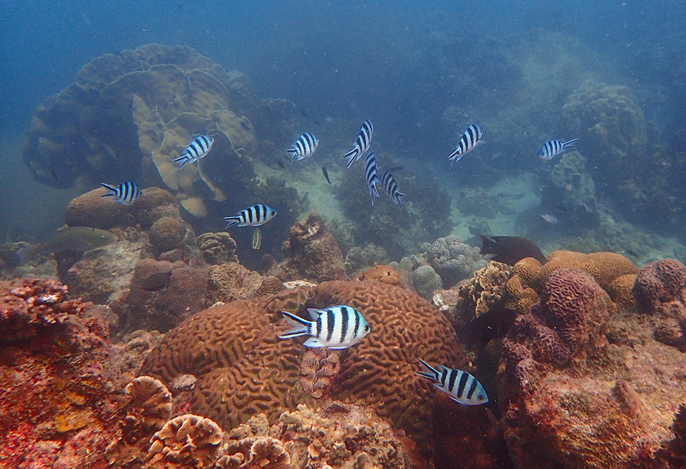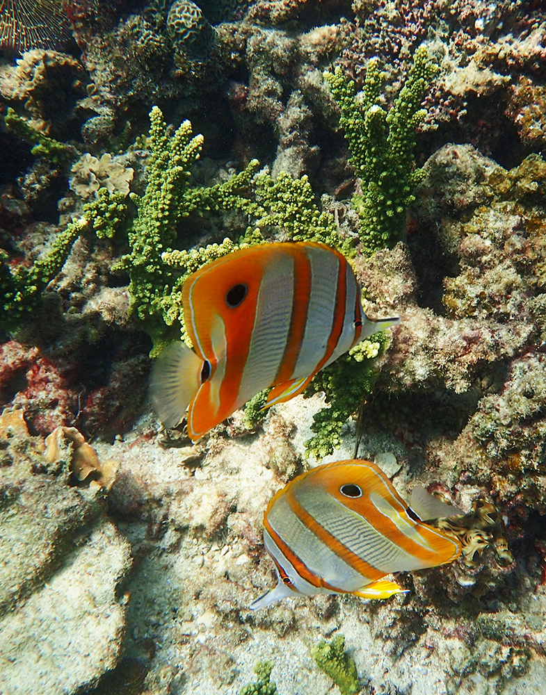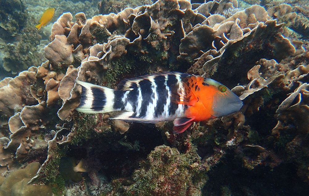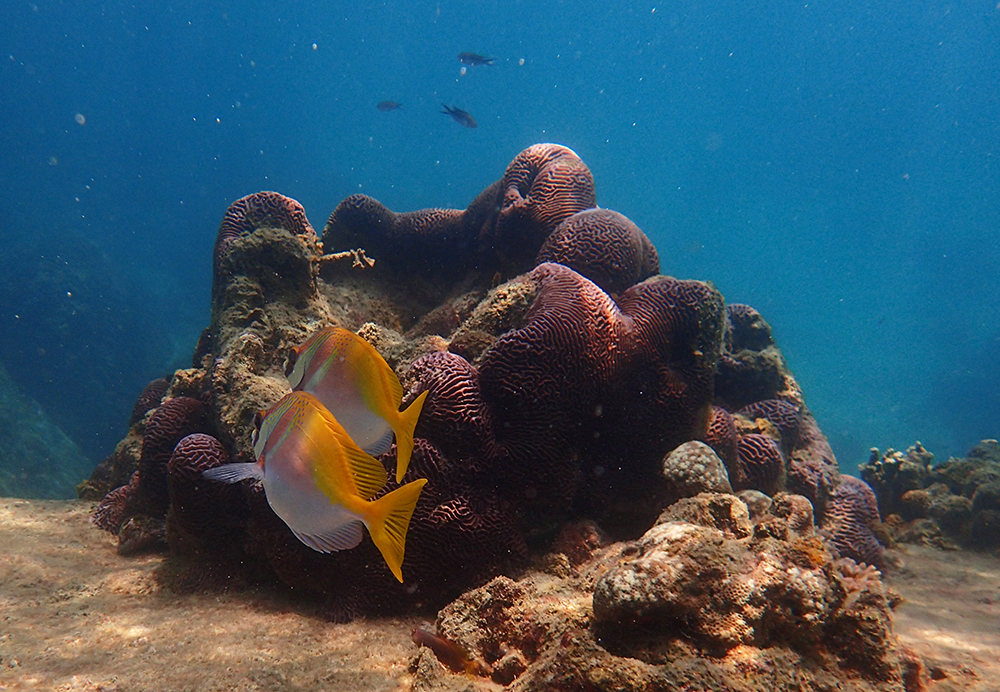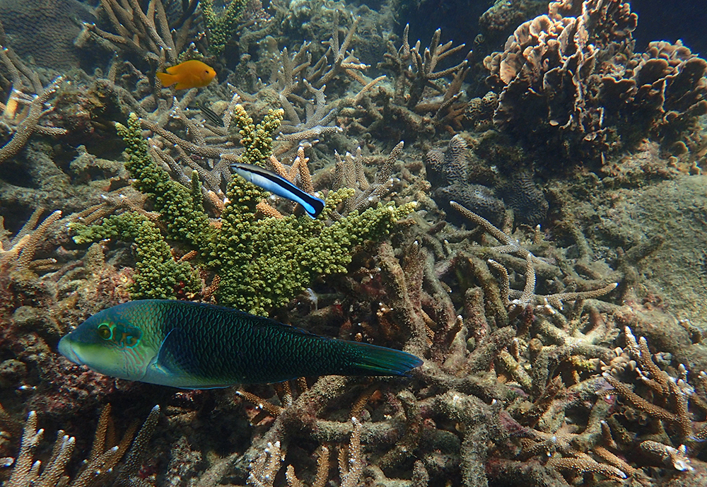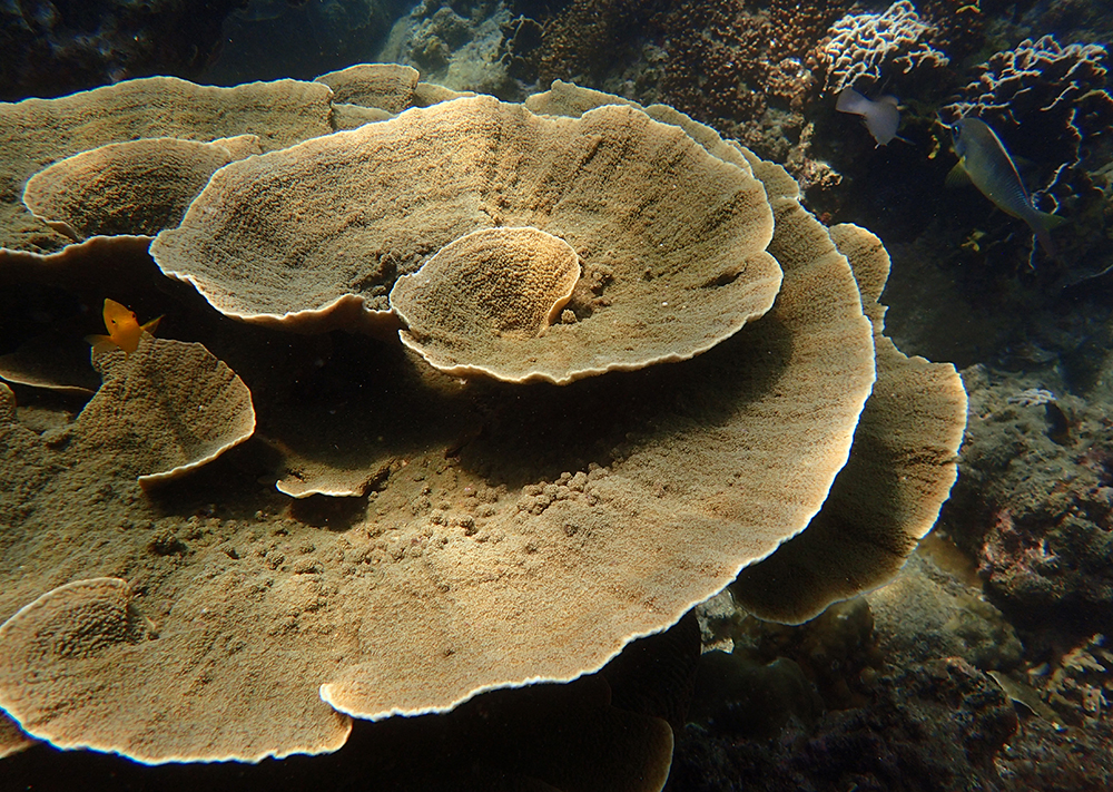 В бухте мы провели около 6 часов в общей сложности, было два больших заныра — первый по левой стороне бухты, второй справа. Кораллы ограничены буйками, чтобы лодки туда не заплывали. Между погружениями ели, отдыхали и убирались.