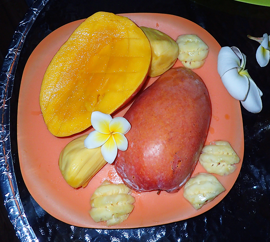 Сравнительный размер манго и мини-ананасов выглядит забавно. Помимо желтых тайских манго на остров привозят еще вот такие огромные розовые, они подороже, стоят 100 бат за кило.
