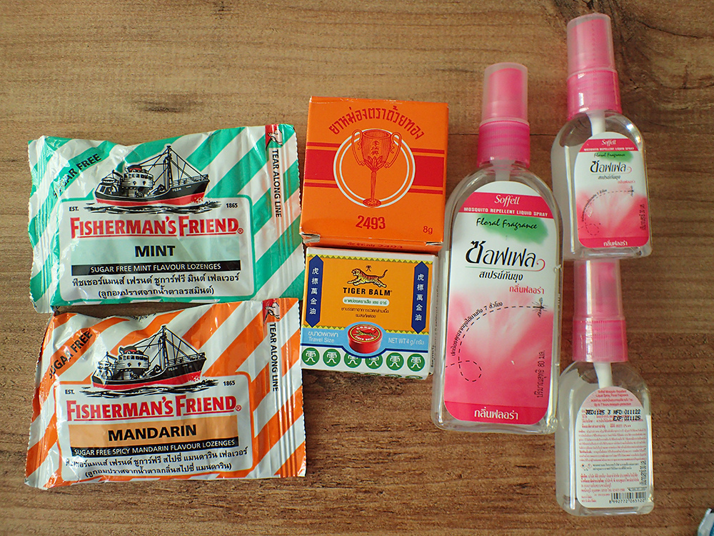 Слева леденцы от укачивания, которые что-то не очень работают, как оказалось. Тигровые бальзамчики и тайские репелленты. Только тайцы умеют делать репелленты, которые приятно пахнут. Все из 7-eleven.