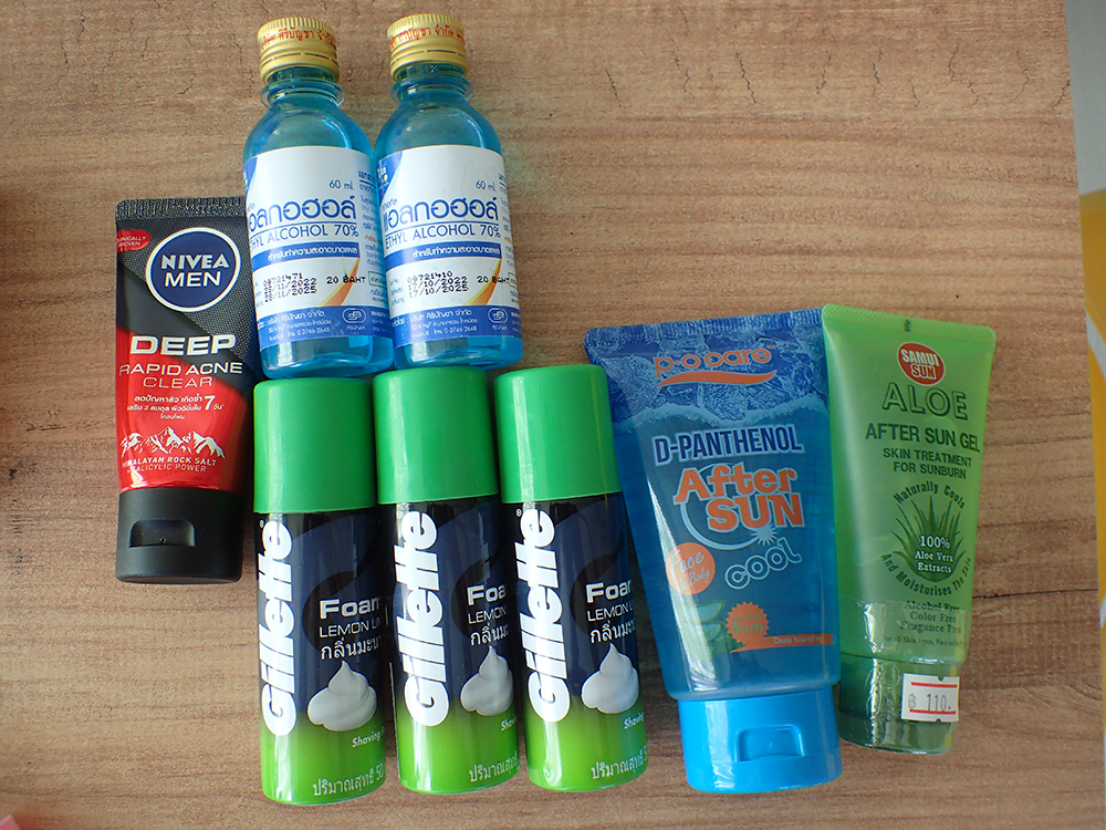 Там же куплены мужская умывалка, мини-баллончики с пеной для бритья, тоже для поездок. Спирт в аптечку путешественника, гели с алоэ от солнечных ожогов.