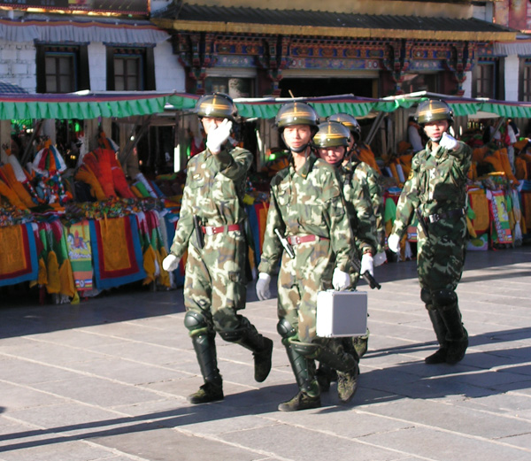 Для психологического давления (и не только психологического) в каждом квартале Лхасы есть взвод китайских солдат. Они стоят на посту, или маршируют, или дежурят на крышах. Фотографировать их нельзя. Но эти были слишком тупы, их удалось обмануть и не стереть этот кадр: