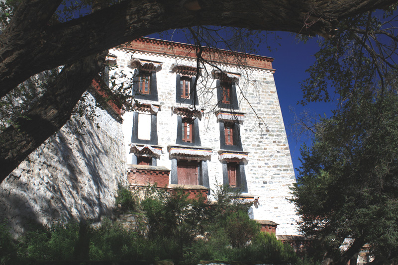 Цвета тибетских строений вообще и храмов в частности имеют символическое значение. Белый - цвет Авалокитешвары, боддхисаттвы сострадания. Красный - цвет Маньджушри, боддхисаттвы мудрости. А черный - цвет Махакалы, защитника учения.