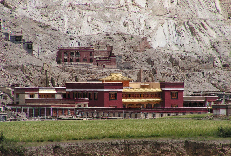 Монастырь Сакья был построен вокруг нескольких деревьев, из которых в 11 веке внезапно начала сочиться кровь. Стволы деревьев стоят внутри главного храма до сих пор. Не знаю, потому ли, но основное здание сделали красным.