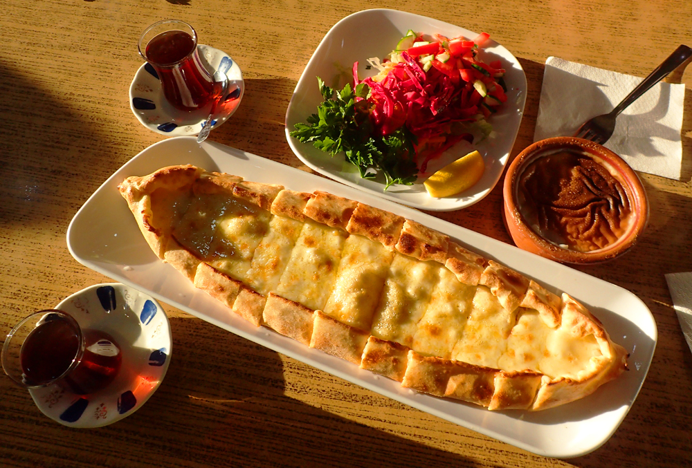 Открытая лепешка называется пидэ. У нас с сыром — кашарли пидэ.