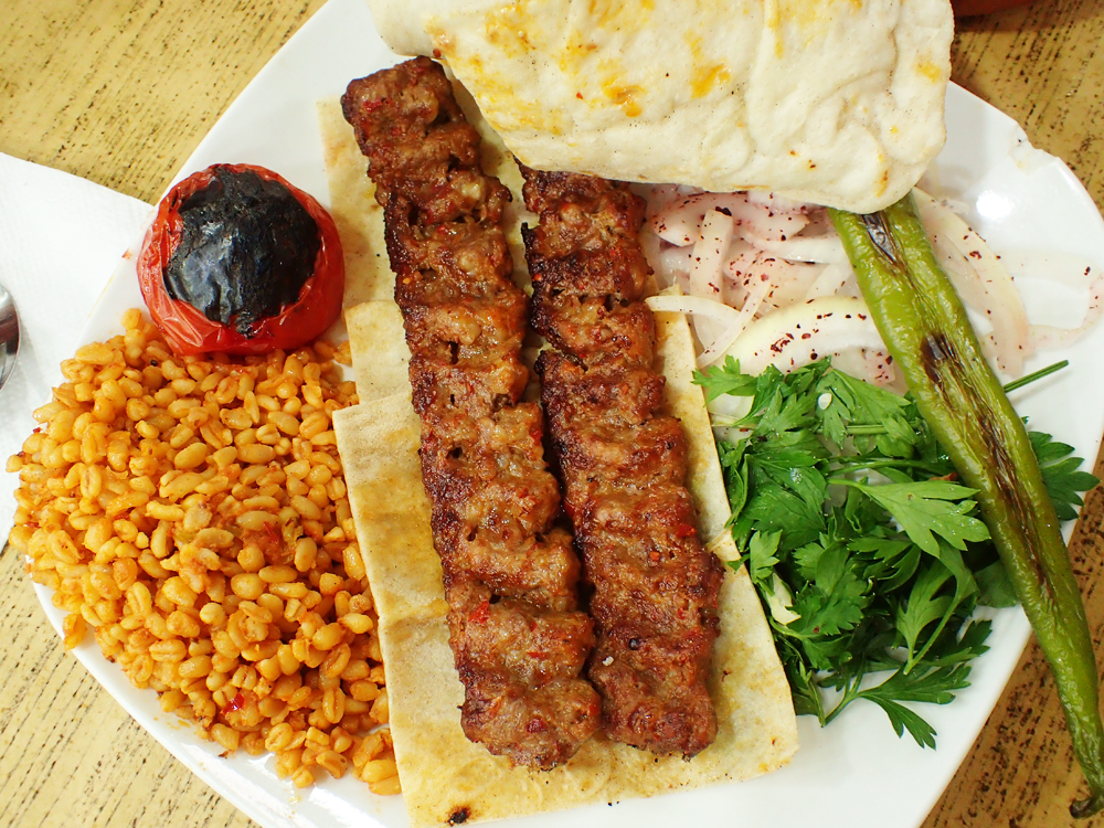 Адана-кебаб из стамбульской привокзальной кафешки. Очень пряный фарш, запеченный на огне на шампуре.
