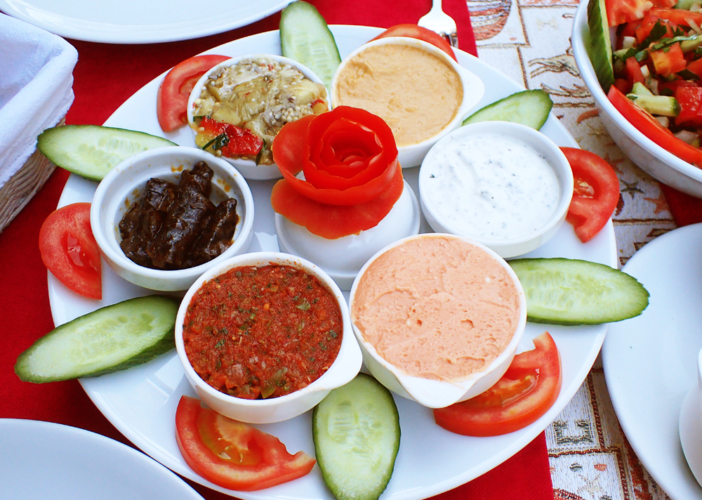 Мезе — это набор закусок, к которым дают нужное количество свежих теплых лепешек.