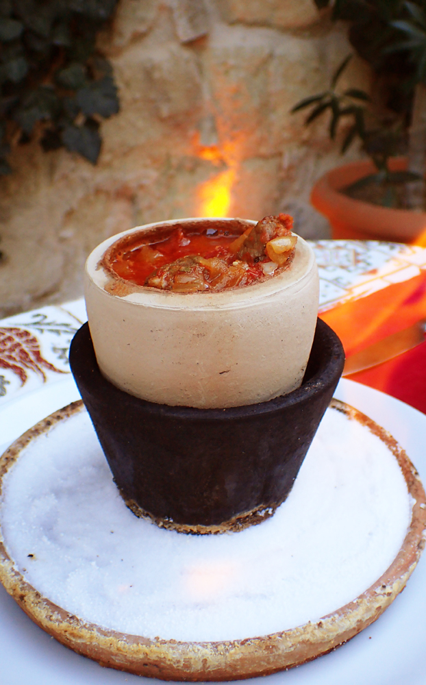 В Каппадокии очень распространены тести-кебаб. Это мясо, тушеное в горшочке. Причем горшок запечатывают наглухо, а потом отбивают приклеенную глиной крышечку.