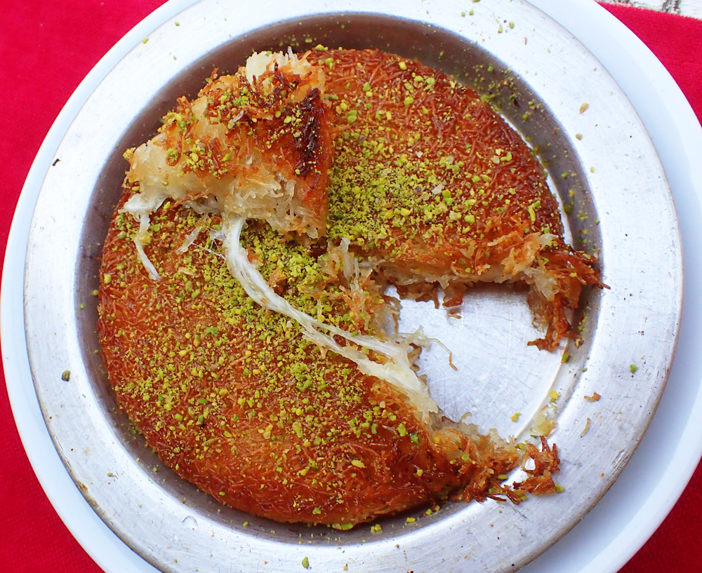 Когда-то это была аристократическая дворцовая сладость. Для кюнефе используют особое тесто кадаиф, похожее на тончайшую вермишель. Внутрь кладут белый сыр, все это запекают и заливают сиропом. Едят теплым. Для кюнефе используют специальные формочки. Говорят, что тесто у нас где-то можно купить в виде полуфабриката, делать его самостоятельно малореально. Ну что... каждый вечер ели кюнефе, одну мисочку на двоих, отказаться невозможно было.