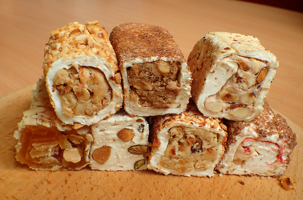 В отличие от дешевых кубиков лукума, которые сделаны в основном из крахмала, тут другие ингредиенты. Есть нуга, орехи, мед, сухофрукты... не знаю, что еще.