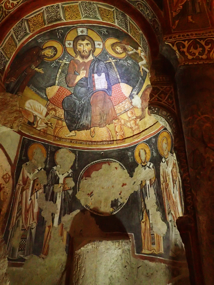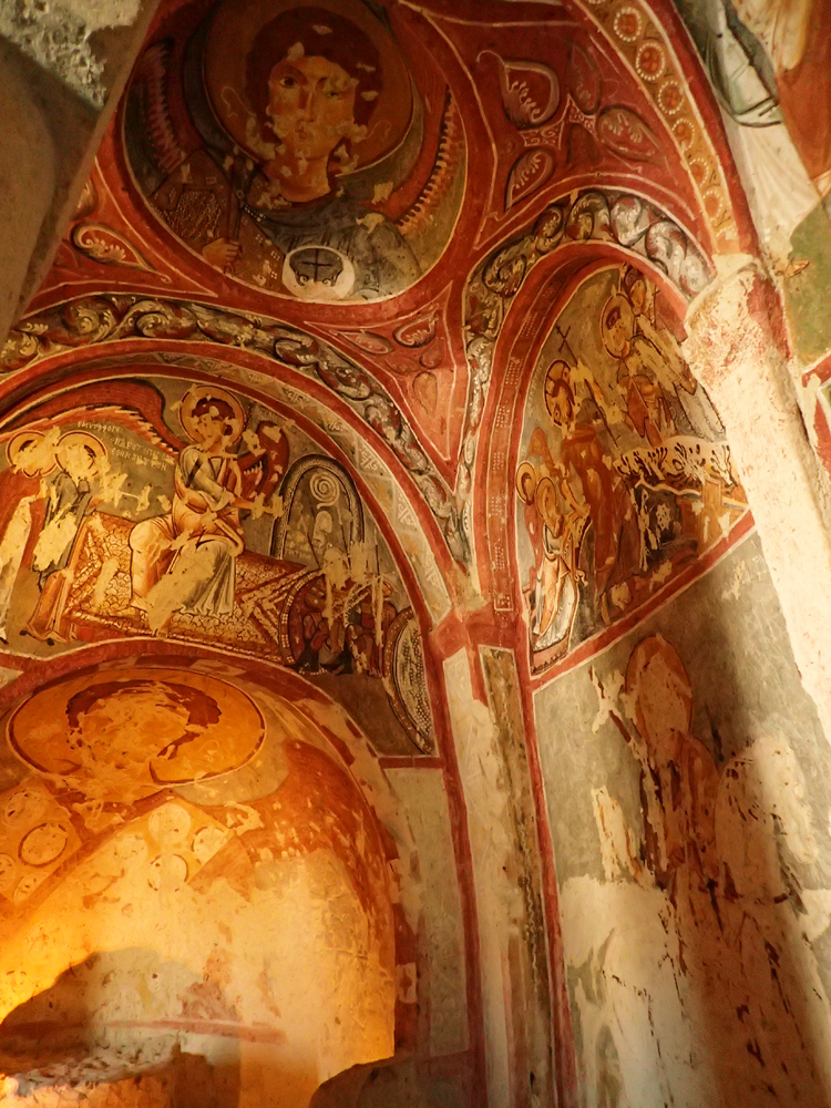 Больше тысячи лет назад в Каппадокию из Константинополя уходили жить монахи, которым не нравилось иконоборчество. Они рисовали в пещерных храмах всё, что что им не давали рисовать в столице. И рисовали хорошо. Турки впоследствии большинство фресок испортили, особенно лица, но успели не везде, кое-какие фрески уцелели.