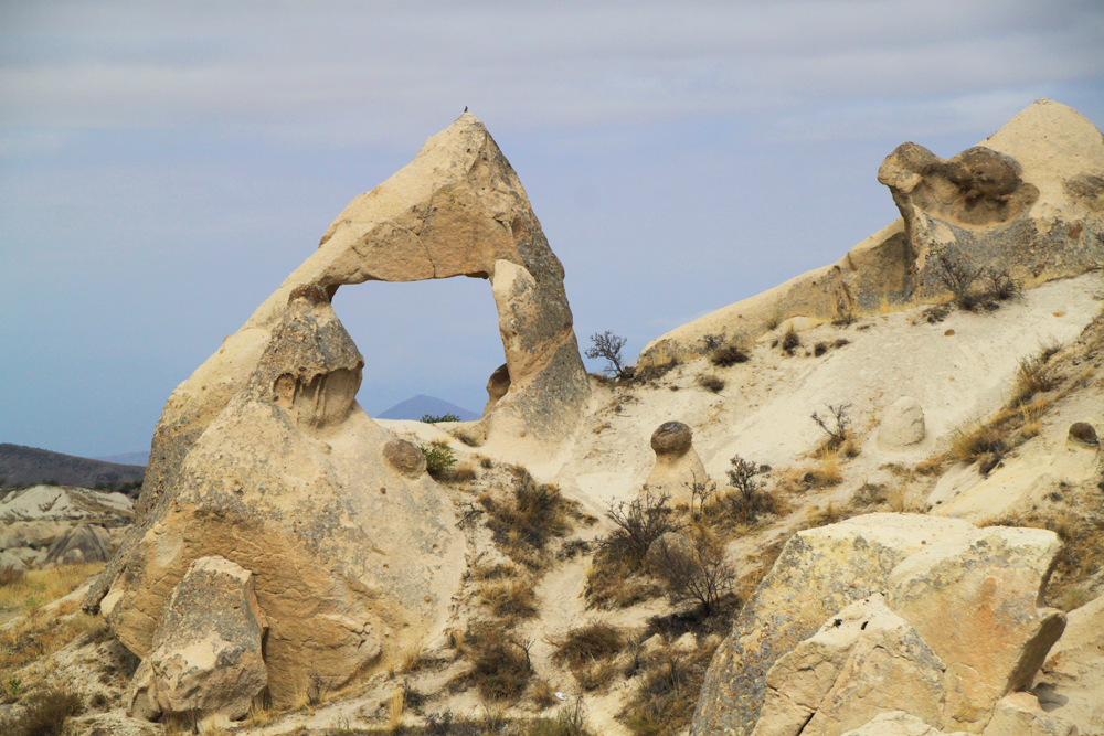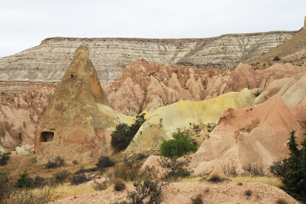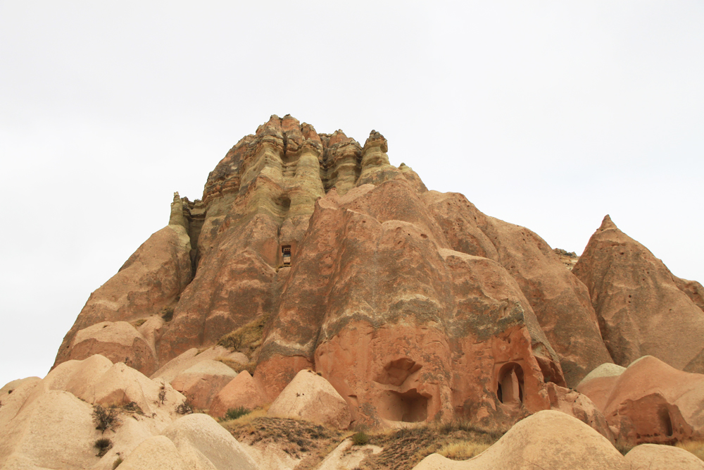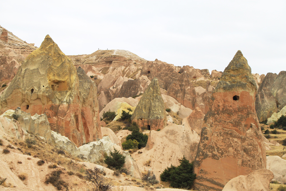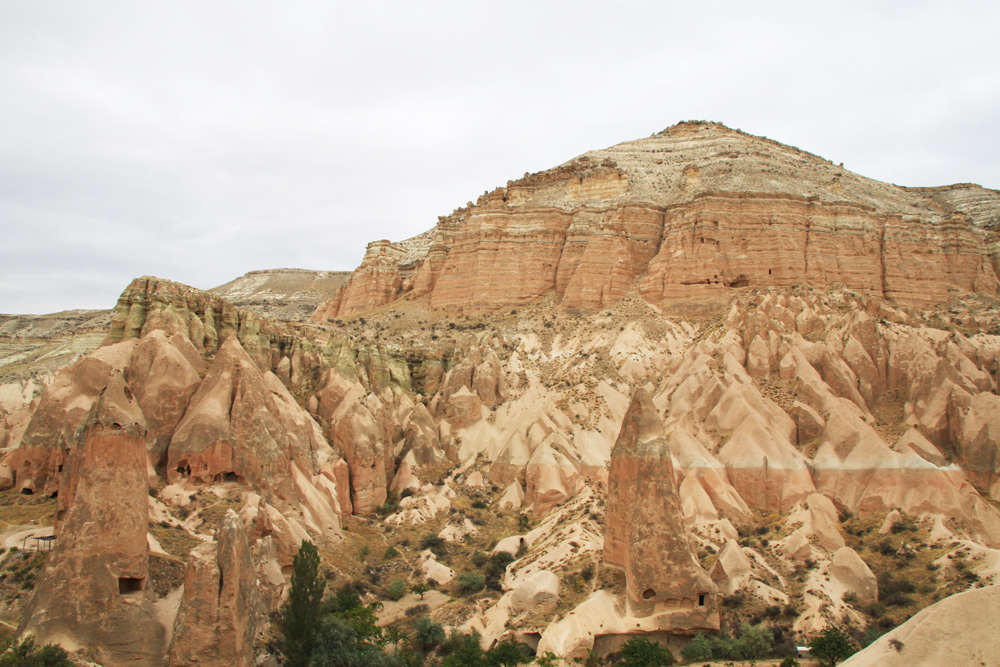 Сюда подведен асфальт и привозят экскурсионные автобусы, в основном смотреть на закат. В этот день закат нам не грозил, было пасмурно. Так что мы посмотрели в дырку, за которой был ничем не примечательный горно-степной пейзаж, и пошли в сторону Гёреме вниз по Красной долине.