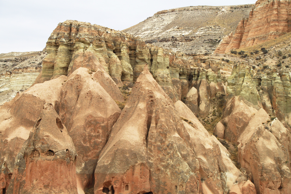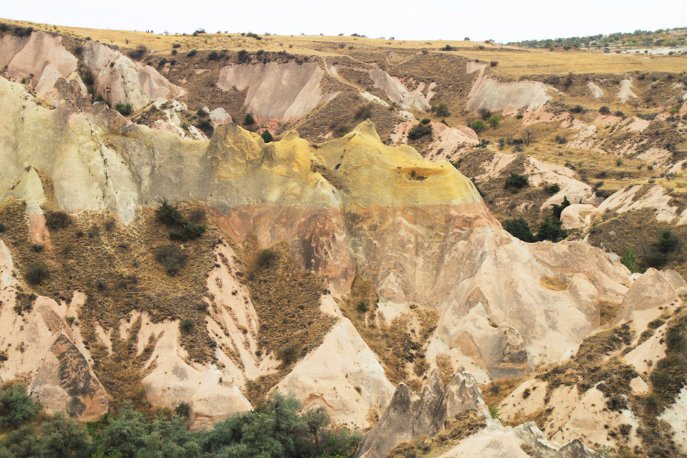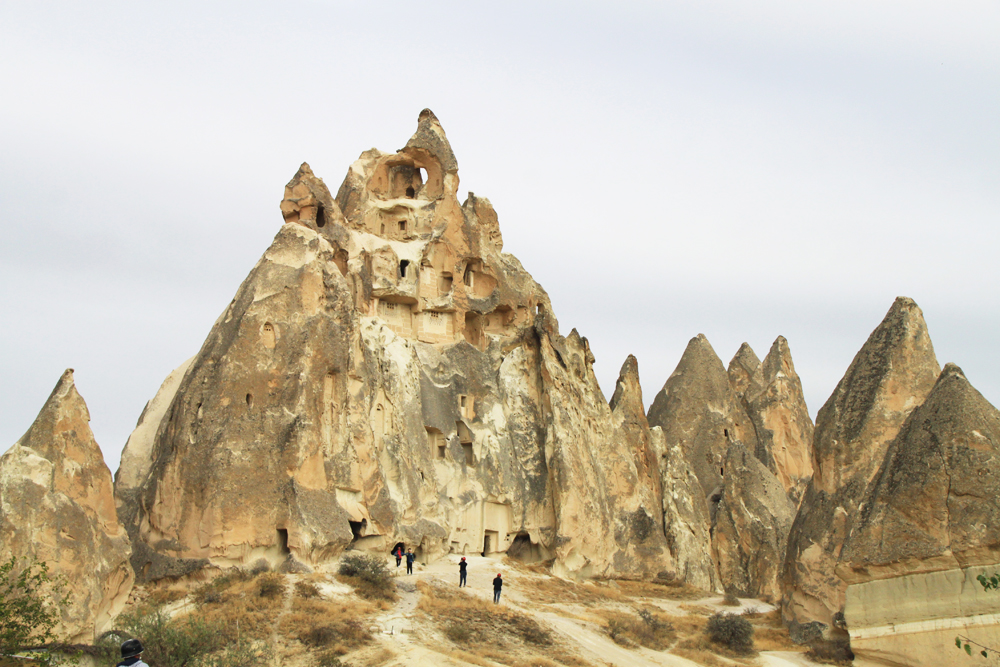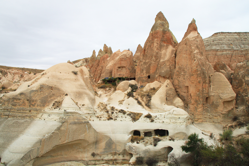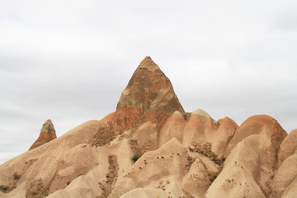 Сюда подведен асфальт и привозят экскурсионные автобусы, в основном смотреть на закат. В этот день закат нам не грозил, было пасмурно. Так что мы посмотрели в дырку, за которой был ничем не примечательный горно-степной пейзаж, и пошли в сторону Гёреме вниз по Красной долине.