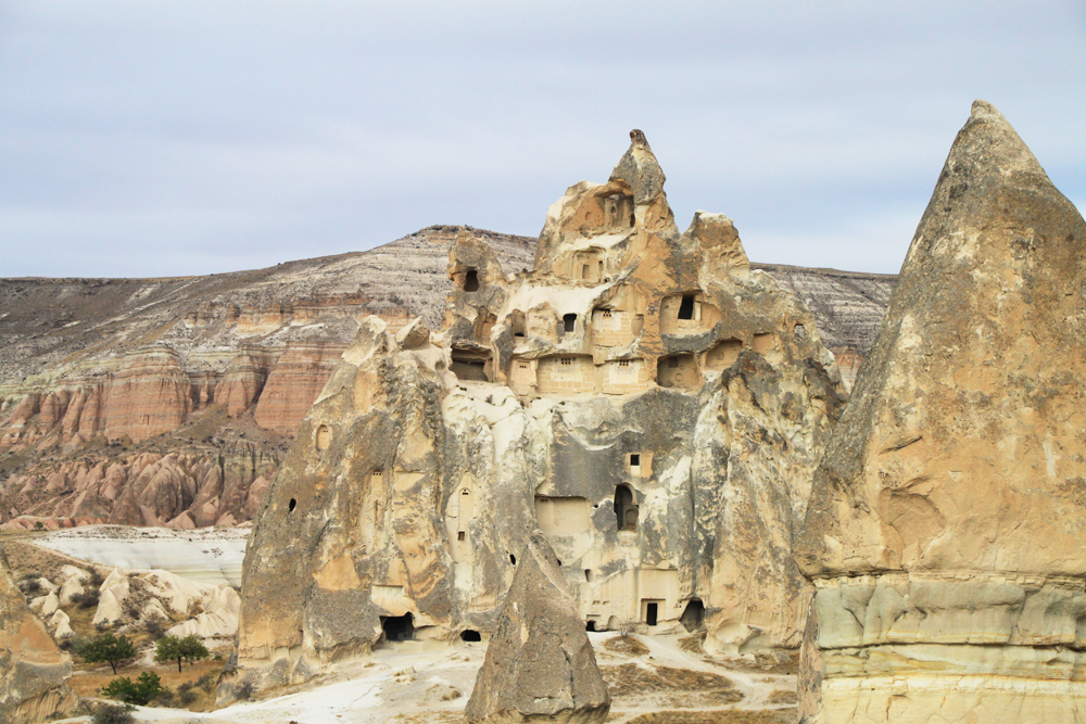 Каменные грибы, между которыми далеко-далеко виден Учхисар.