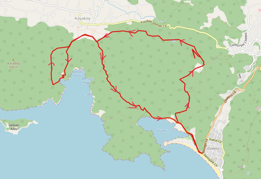 В первый день мы ходили из Олюдениза до заброшенной деревни Каякёй, а от нее в Бухту Холодной воды. Вот наш трек.