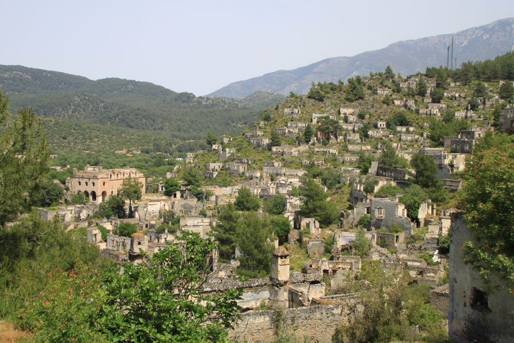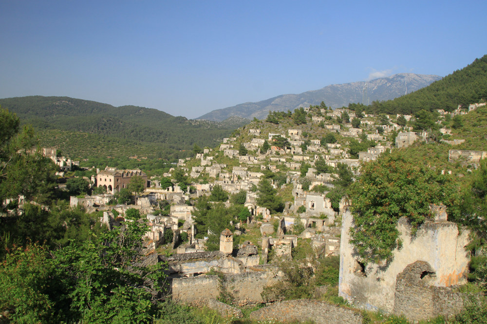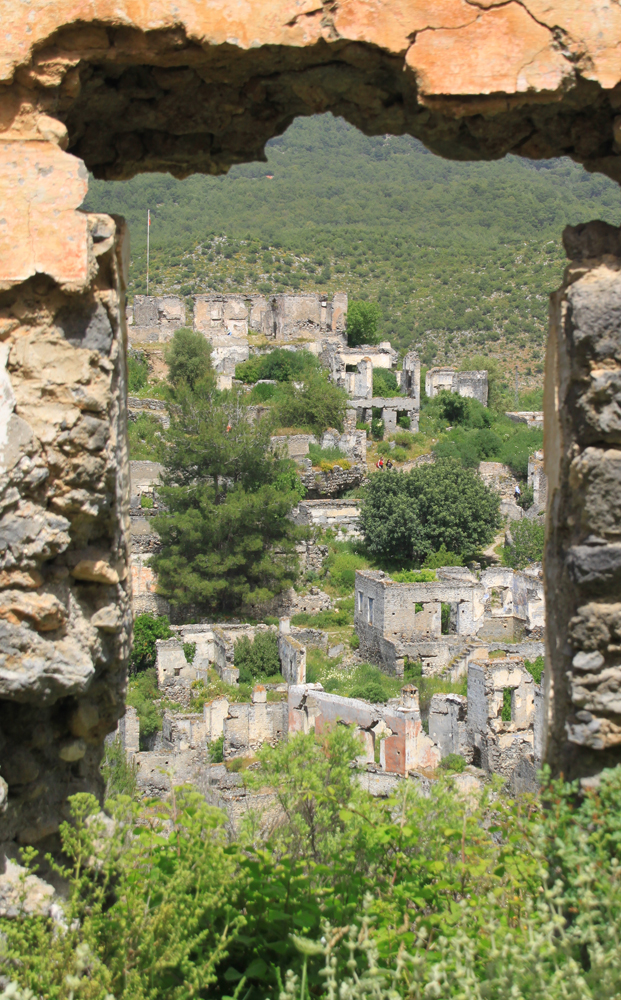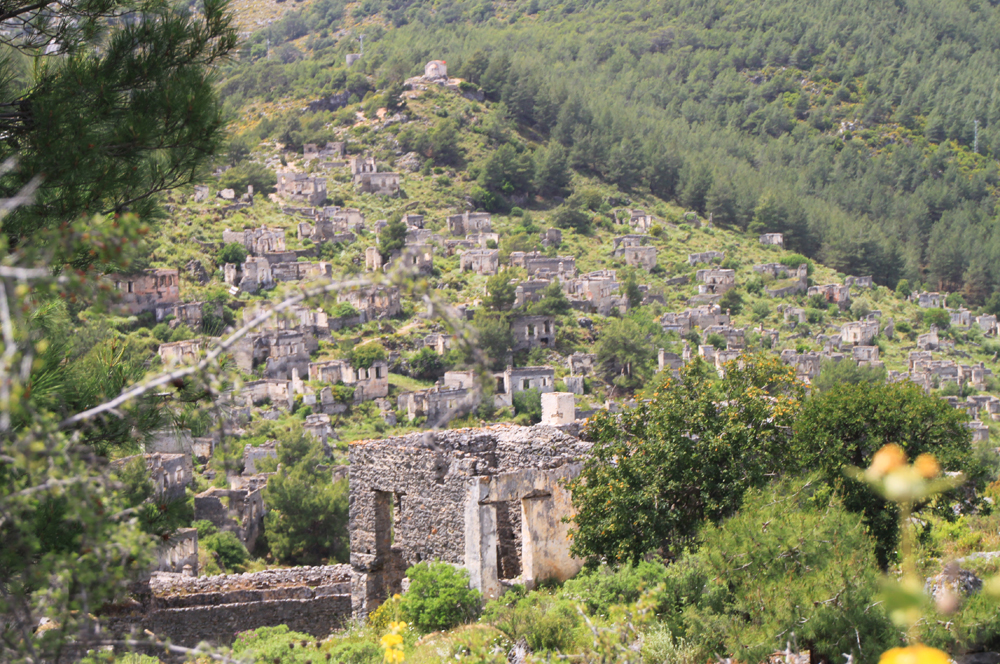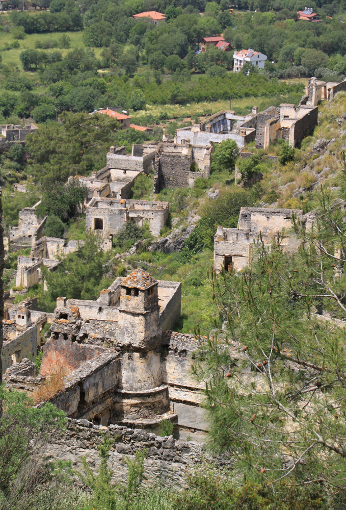 Греция совсем рядом, через пролив остров Родос, вообще непонятно, как греки тут жили отдельной деревней до 1923 года. Турки построили новые дома ниже по склону, в старых жить не стали. На этой фотографии видна граница старой и новой деревень.