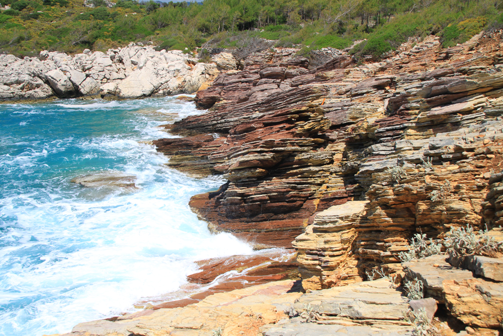 Через некоторое время с грунтовки можно свернуть на чудесную лесную тропинку. Бухты по дороге обрывистые и каменистые. В одной были очень красивые слоистые камни и даже построили ступени к воде.