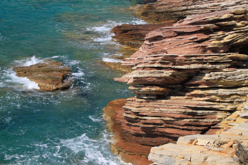 По дороге купались на пляже со слоеными скалами.