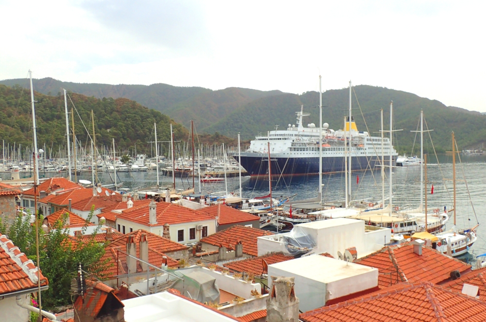 Какой-то круизный корабль зашел сюда, наверное еще весною, и застрял по модной причине. Так и стоит, бедняга.