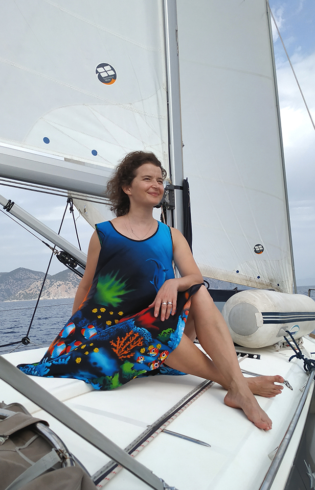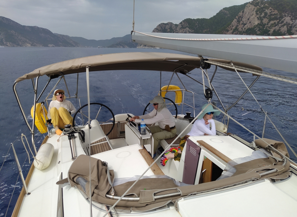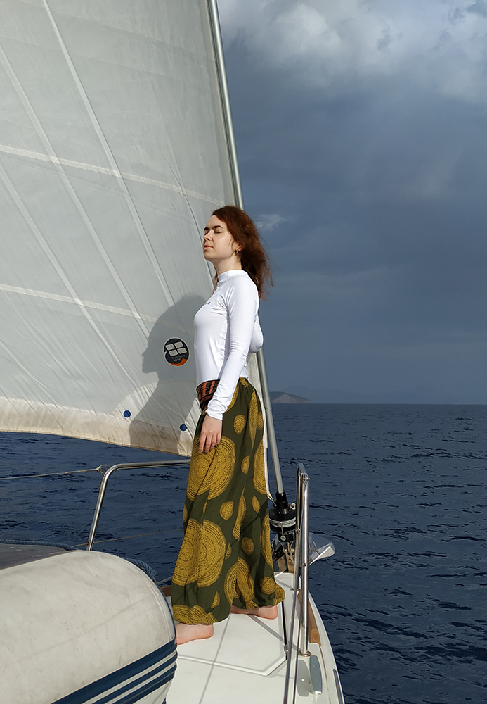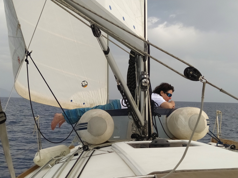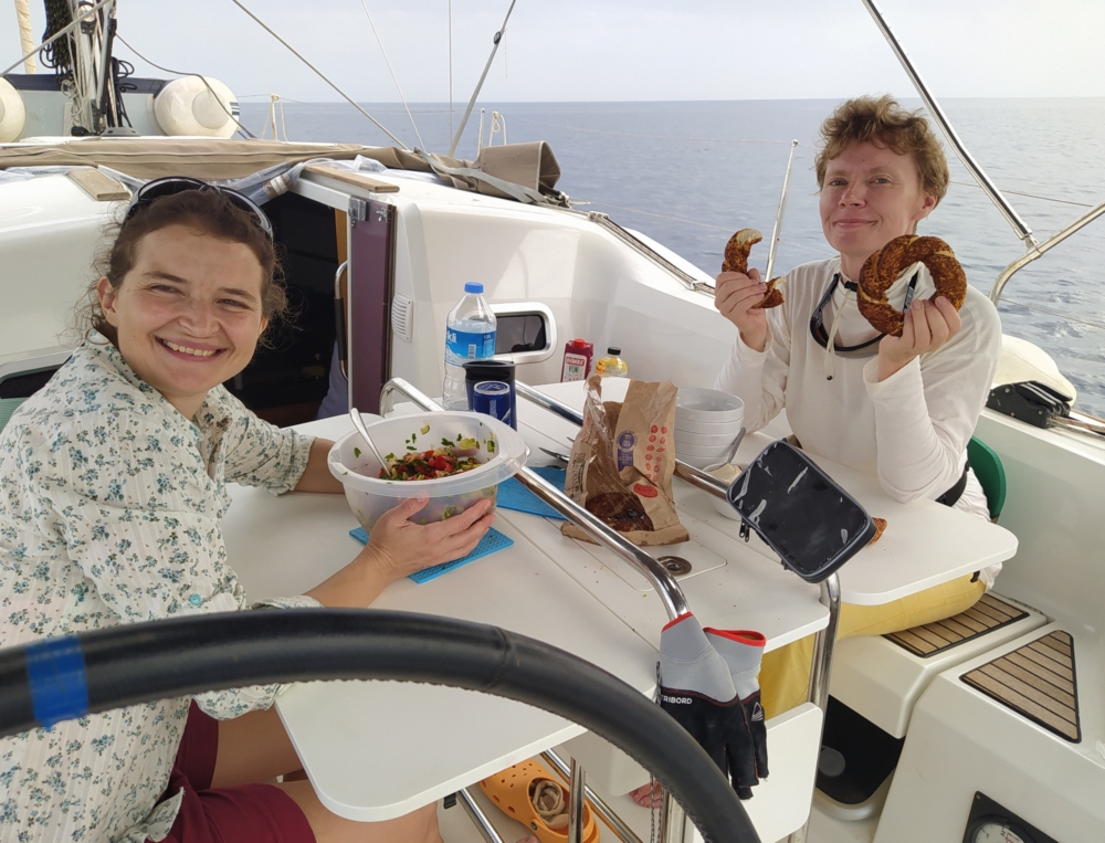 Пытались поставить парус пару раз, купались на конце, на ходу готовили салат и ели его.