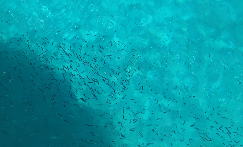 В воде возле яхты было много-много мелких рыбок.