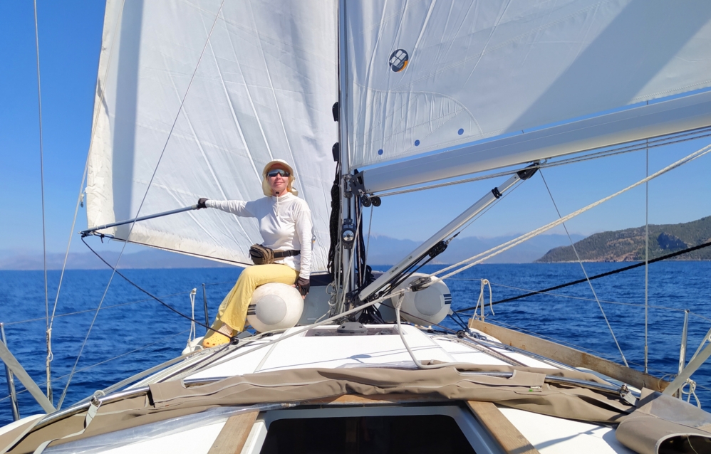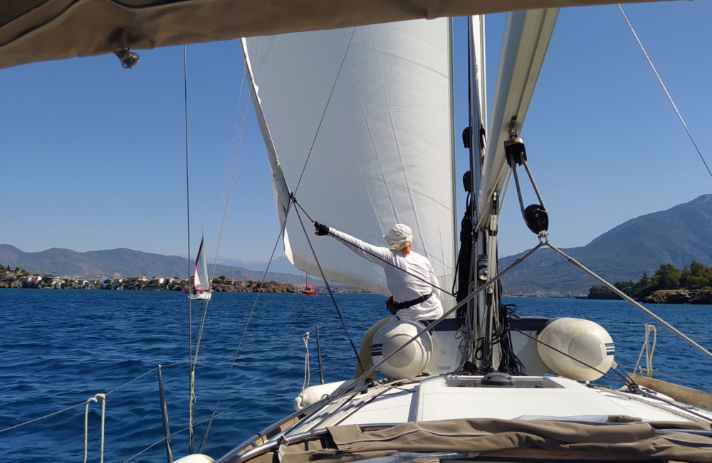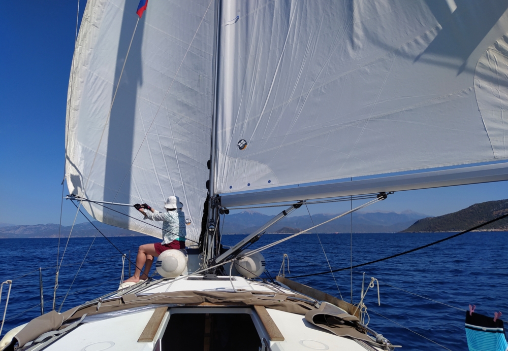 В конце к мотору еще и стаксель поставили, чтобы обогнать пару желающих придти раньше нас в марину. День сдачи яхт, возможные очереди на заправку, мы решили поднажать. А в случае попутного ветра парус дает лишний узел к крейсерской скорости на моторе. И вот так получилось, что парус был натянут не очень сильно и багор стал не нужен, можно было держать парус рукой.