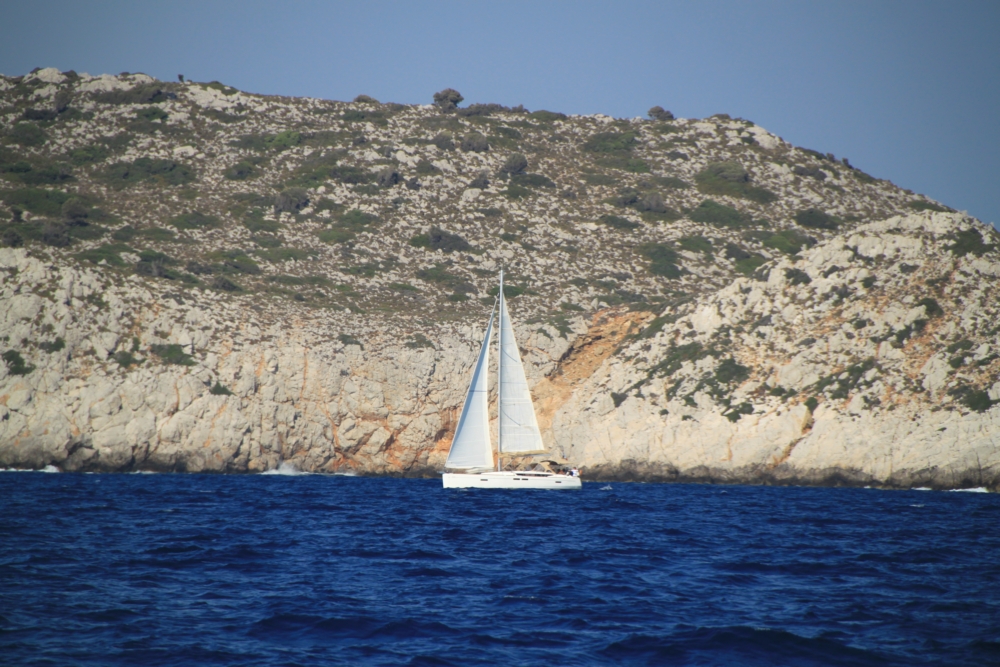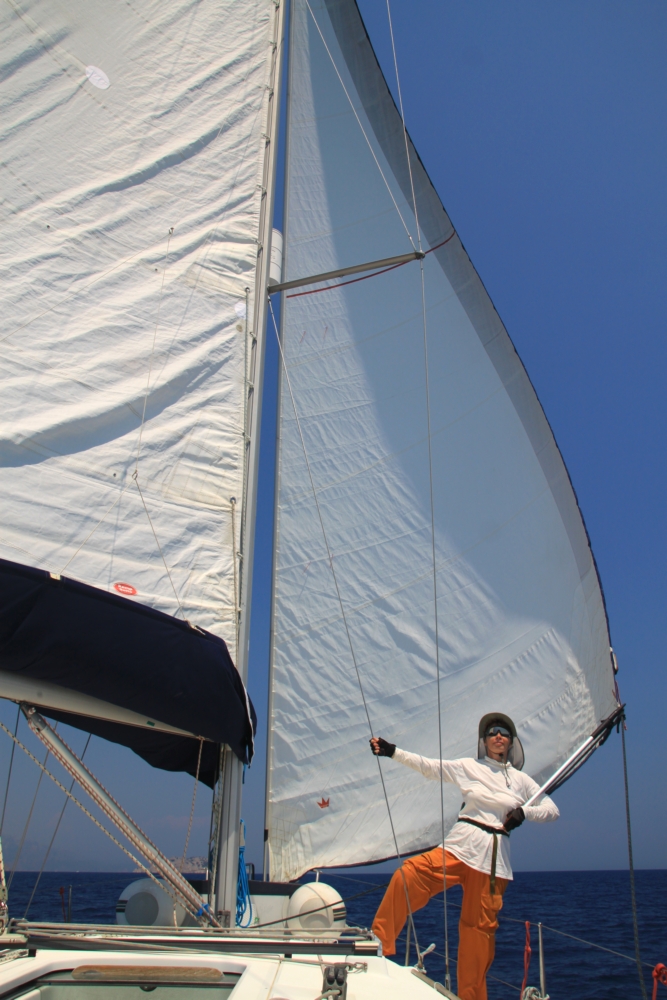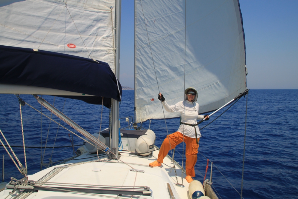 А после девяти утра уже вышли в море. Первые два часа шли на моторе, потом поставили парус. Сперва был тихий бакштаг и я ринулась купаться на конце.