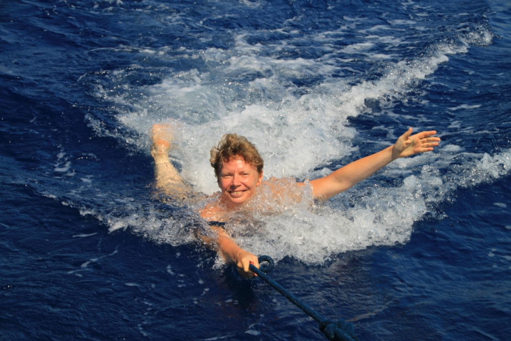 Вы так не делайте, если идете вдвоем. Очень большой риск, когда резко меняются ветра. Пока я купалась, раздуло до 10 узлов и вылезать при 5,5 узлах скорости было очень трудно. А Ран искупаться не успел, через 15 минут рифили грот, а потом и вторые рифы взяли, и встегиваться пришлось.