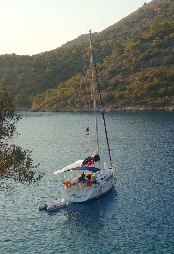 Возле острова Гемилер стоит много яхт, постановка на якорь под боковым ветром там была непростой. Да еще, не успели мы встать, нас стал кошмарить океанис «Исилдур» с неопытными русскими на борту: они долго, опасно и неправильно вставали рядом. Сперва надо зафиксировать якорь, а потом растягивать конец. Если делать это одновременно, то якорь может не схватиться, и у них так было раза три, а то и все четыре.