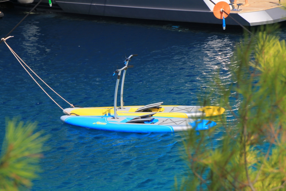 А есть еще доска с подводным мотором, выходящая на глиссирование. Правда, падают с нее задорно, потому что она развивает большую скорость и держаться на ней не за что.