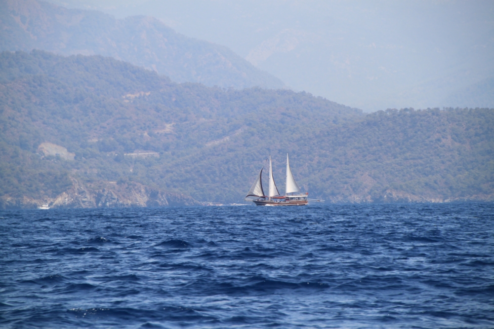 7 августа вышли из бухты в 10 утра и вполне хорошо прошли под парусом от Скопеа Лимани практически до заворота в бухту Фетхие.