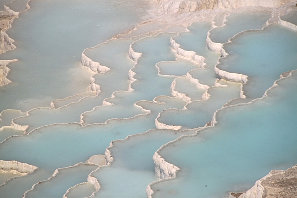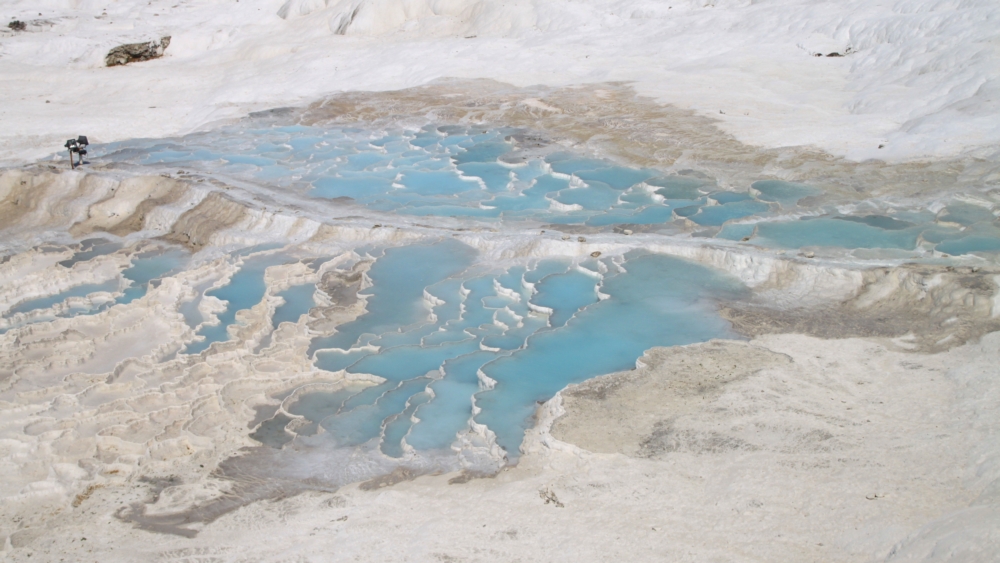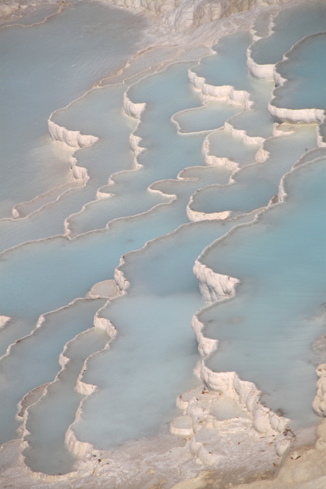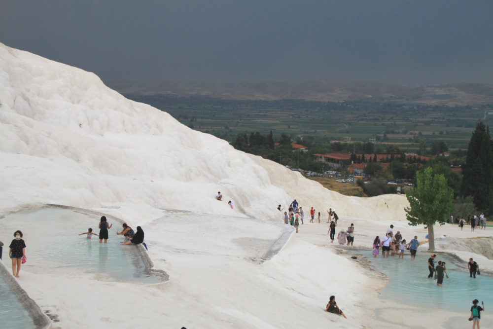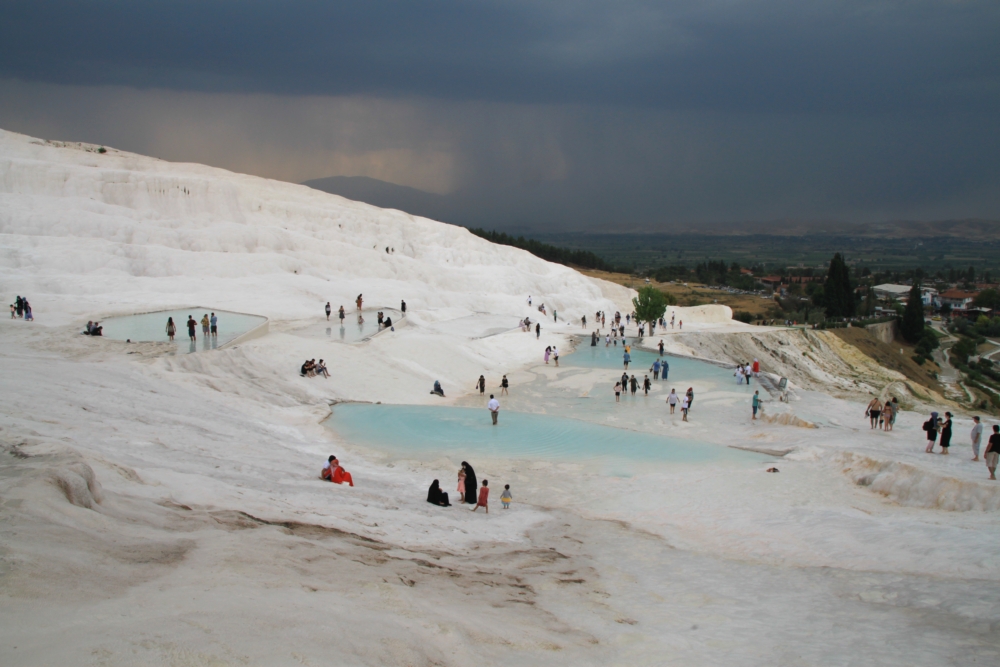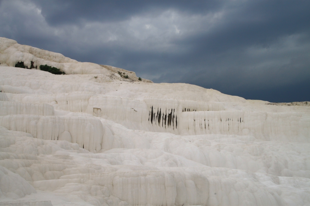 Если вы читали мой прошлые рассказы про Памуккале (1 и 2), то помните, что на все террасы воды не хватает, поэтому каждый день поток пускают в другую часть террас. И ты каждый раз приходишь и видишь новую картинку. Вот почему обязательно надо ночевать в поселке, смотреть в разные дни и в разное время суток. Ну и климат тут неустойчивый, тучи бывают часто. Даже когда во всей остальной Турции жара и палящее солнце.