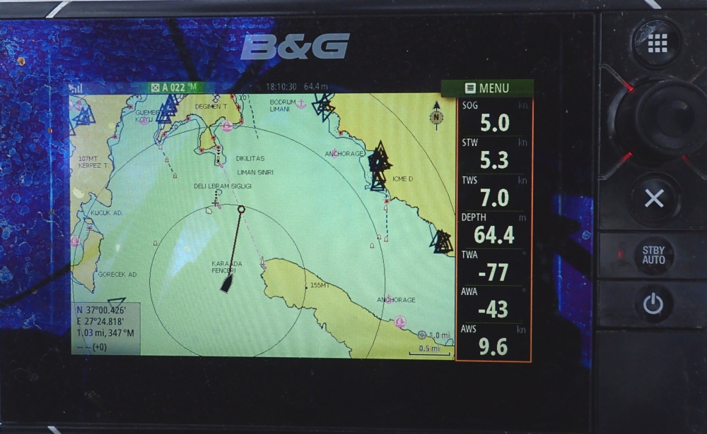 До Бодрума идти нам было 25 миль, это около 5 часов. Из них почти 4 часа под парусом. Нам был бейдевинд и вот что удивительно: при относительно слабом ветре наша яхта шла больше половины скорости ветра. Я даже показания приборов сняла, так это чудесно.