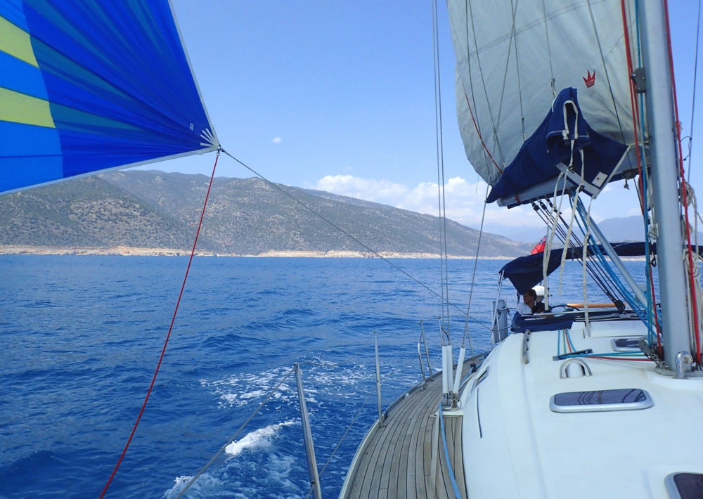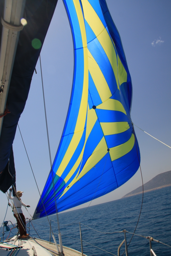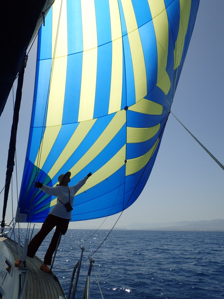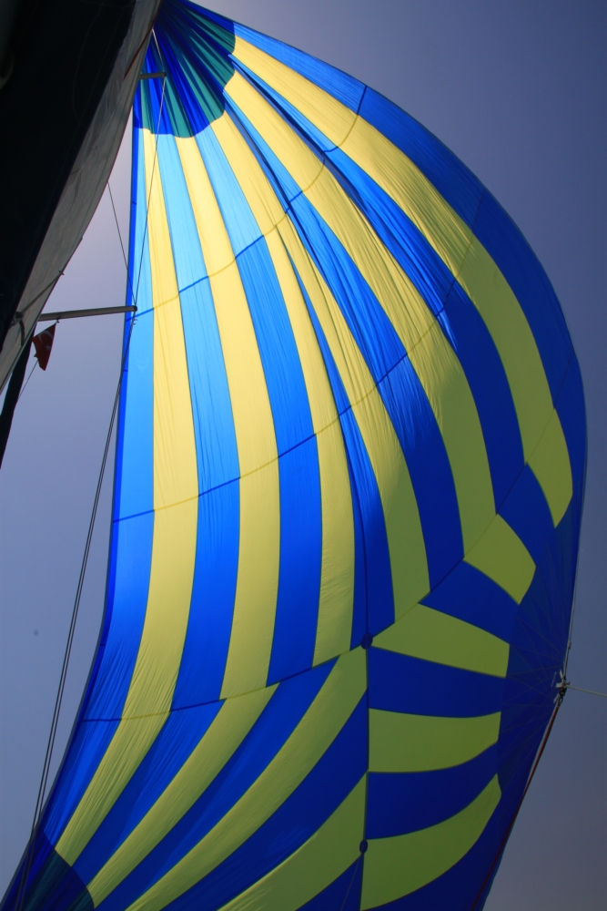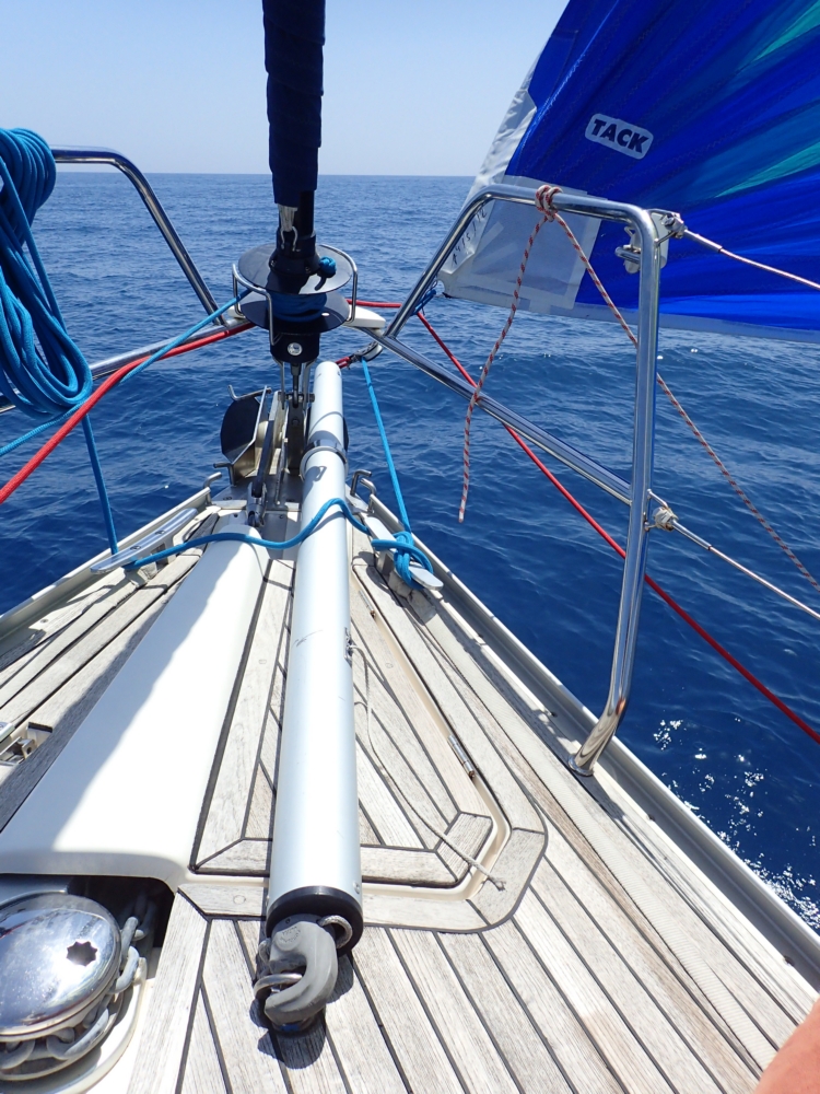 Меж тем наступило лето, днем было жарко. До обеда мы разбирали паруса и концы. У нас помимо большого стакселя есть еще два паруса — генакер и код зеро — оба огромные и тонкие, каждый в своей сумке. Померили бухты верёвок, поменяли шкоты на стакселе, перевернув их! Потому что уж очень истрепанные были. И другие веревки пухлые от времени и разваливаются, так что сложно закрыть и открыть стопора.