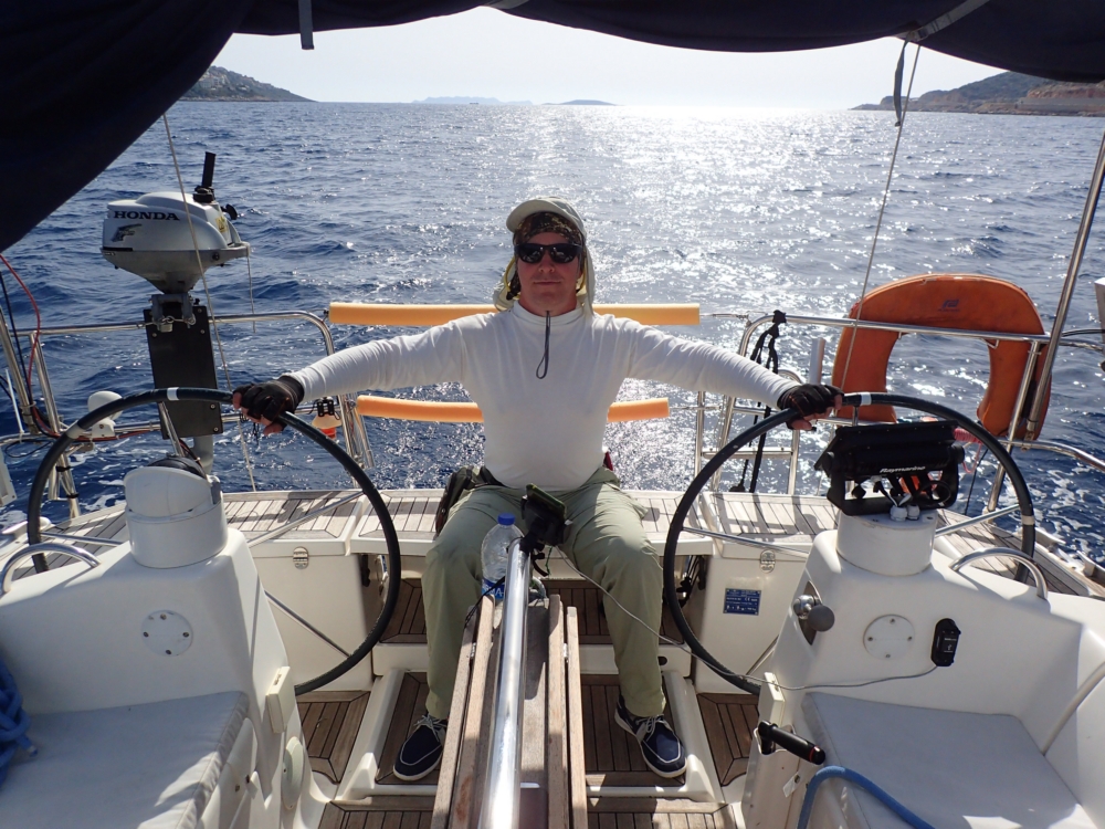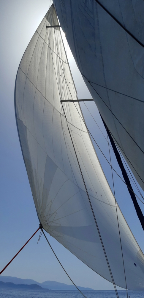 В тот день мы шли недалеко, до залива Скопеа Лимани. Достали второй большой парус, называется код зеро.