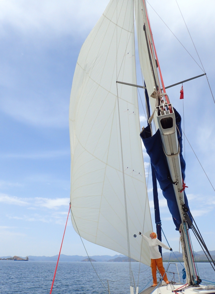 Это такой плоский огромный стаксель, который тоже сворачивается и крепится на бушприт. Но недолго прошли под ним, ветер резко усилился, пришлось спешно сворачивать красавца и идти под своей генуей. Да и грот вскоре зарифили. При сильном ветр яхта шла 6-7 узлов.