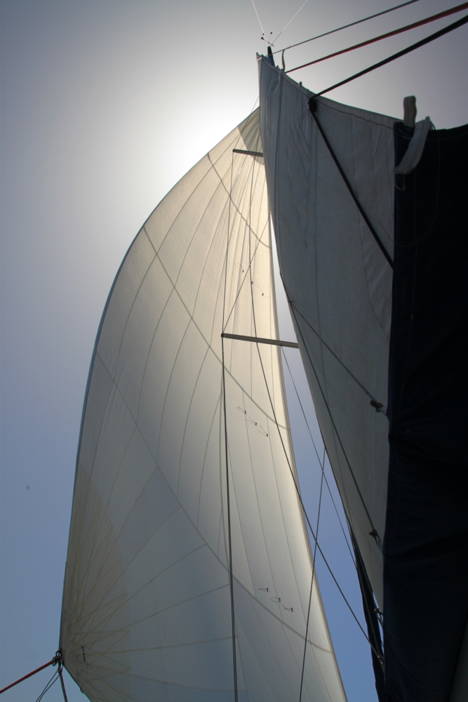 Потом раздуло. Пока думали, ставить ли генакер, раздуло до 15 узлов, и вопрос отпал сам собой: поставили родные паруса. Генакер подходит только для слабого ветра.