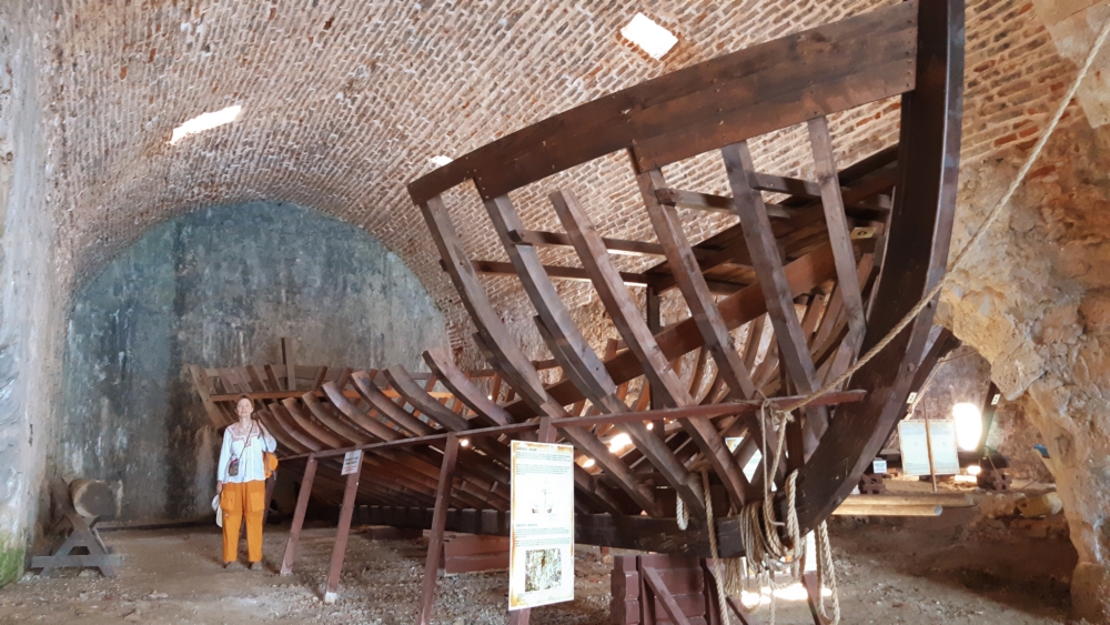 Это остов корабля по имени сковела, двухмачтовое парусное судно 13 века. Я там не просто так стою, а для масштаба. И еще я там стою в офигении. Потому что только что осознала, что наш греческий 50-футовый крейсер, который мы пилотировали вдвоем в июне этого года, ровно такой же в длину и всего на полметра у́же. То есть это в современном мире яхта, а раньше — целый корабль.