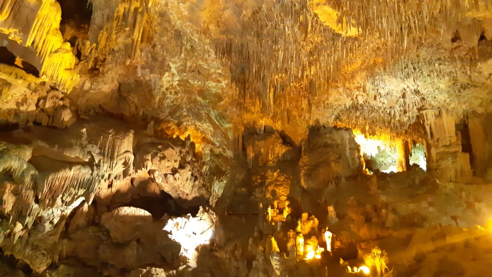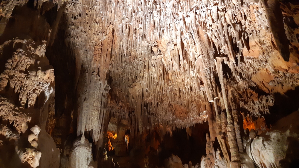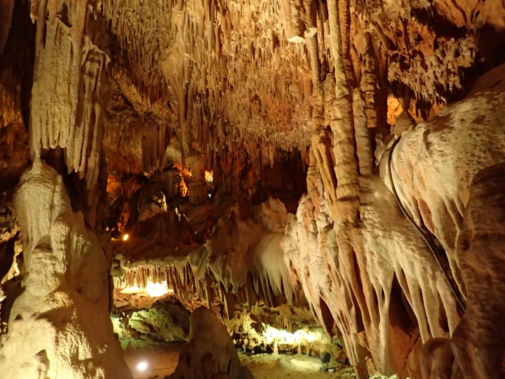 Сперва мы посмотрели на пещеру Дамлаташ, она рядом с пляжем. Маленькая, но симпатичная, с желтой подсветкой.
