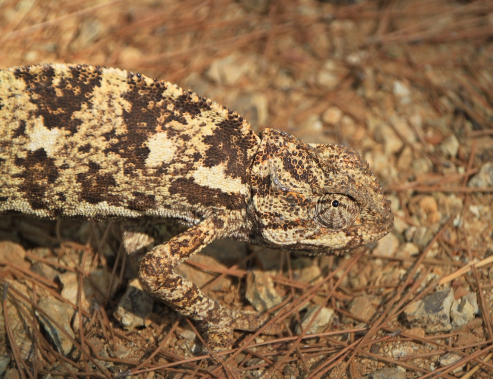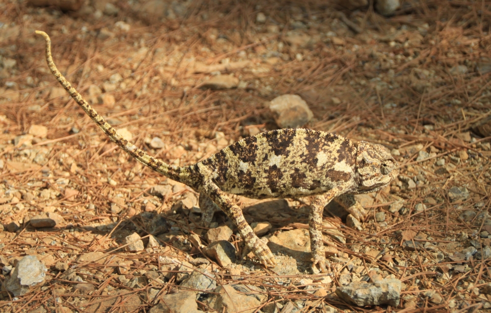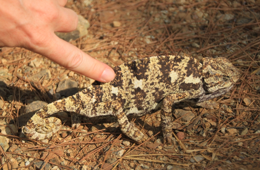 Совершенно беззащитная зверюшка: он не пытался ни бежать, ни прятаться, ни защищаться. Конечно, камуфляжная расцветка помогает, но не очень. Воспользовавшись беззащитностью, погладили хамелеончика. В ответ он скрутил хвост колбаской.