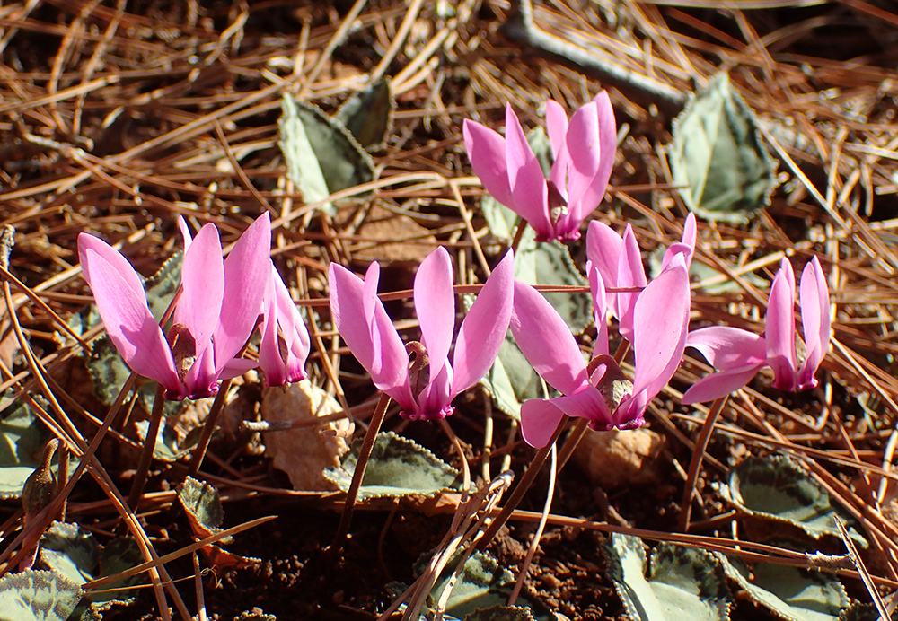 Сосны на этом участке здоровые. А у цикламенов видны листочки.