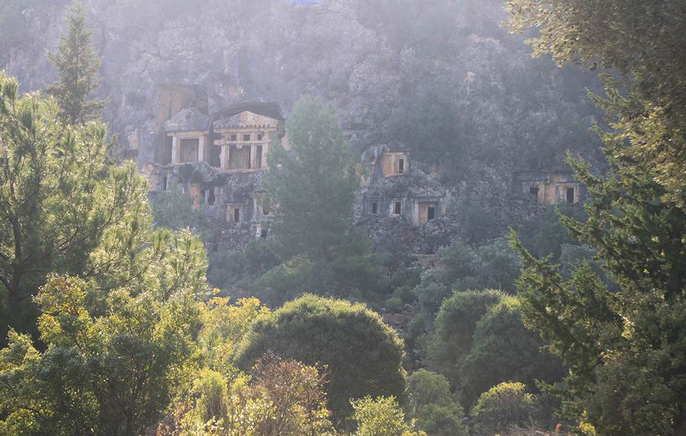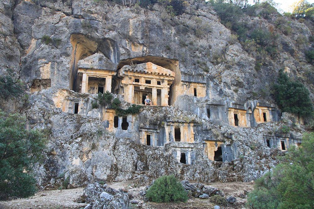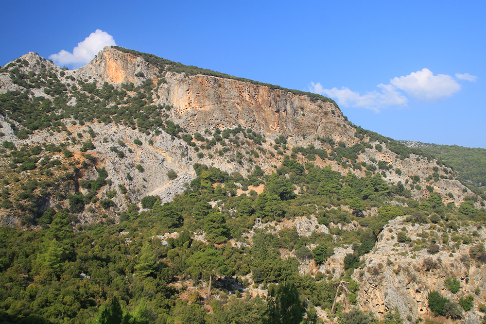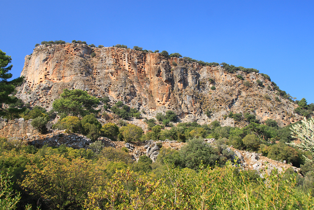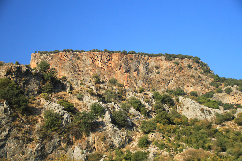 Вот такие «соты» на скалах — это гробницы. А город был расположен под стенами и сейчас довольно сильно зарос.