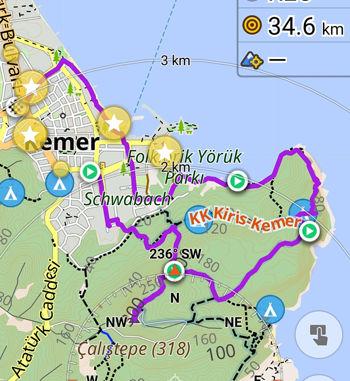 Старт слева от остановки автобуса ТА08, который приходит из Анталии. Финиш в центре Кемера у башни с часами, оттуда проще уехать обратно.
