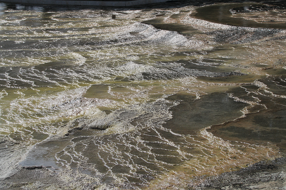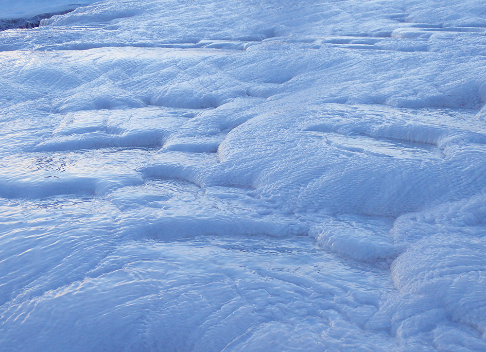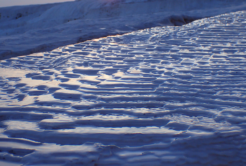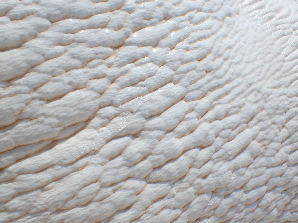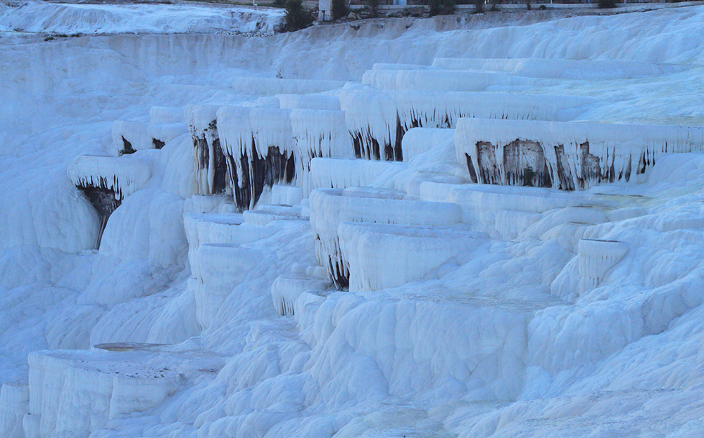 Воду теперь пускают в основном в бассейны и вдоль бассейнов рядом с пешеходной тропой. Другие террасы все стояли сухие, и явно давно. Зато снизу за зиму травертин стал толстым и белоснежным.