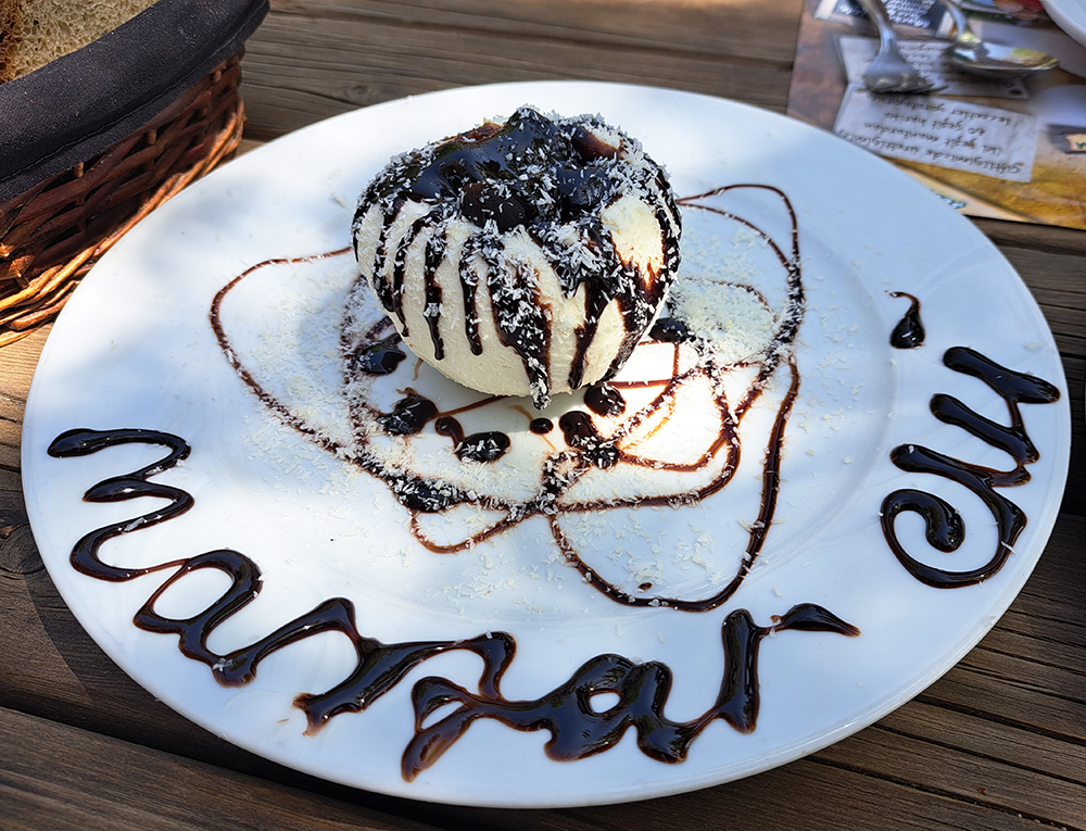 Сверху сладкий каймак с кокосовой стружкой, внутри грибы, тушеные в шоколадном соусе. Варенье тоже взяли — пекмез с корицей и гвоздикой, а внутри реально грибы, очень забавное сочетание.