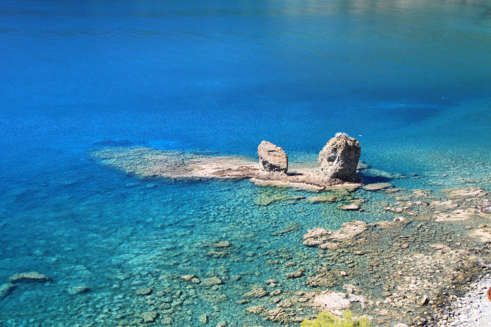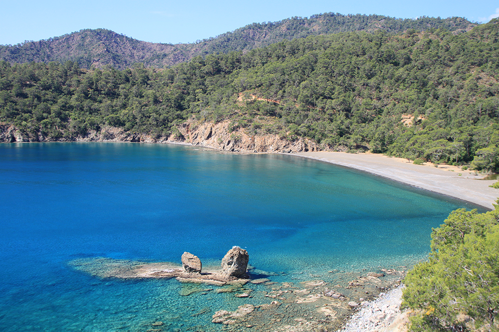 Вода выглядит идиллически, но в этот раз и здесь, и в Маден койю в воде плавал микропластик, откуда-то его нанесло. Вроде бы на пляжах тут не сильно мусорят, и баки мусорные стоят, но случается такая беда.
