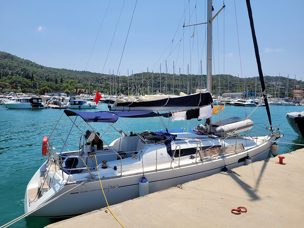 Быстро она действительно не ходила, по спокойной воде под мотором 5 узлов, под парусом идеальный галфвинд — 6–7 узлов. Это был Sun Odyssey 36i, 2009 года, но в хорошем состоянии. На яхте была одна носовая и одна большая кормовая каюта, а вместо второй кормовой каюты — просторный чулан для вещей и еды и отдельное помещение для душа.