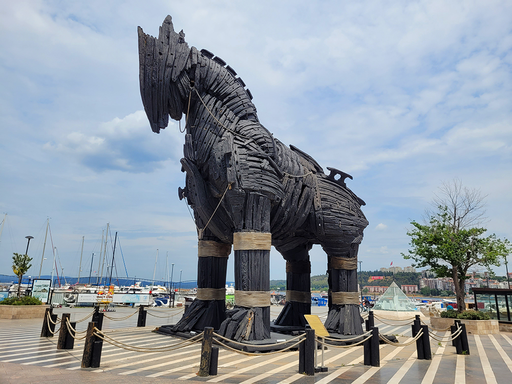 Конь был подарен городу Голливудом, после съемок фильма «Троя». Он очень стильно сделан как бы из того единственного материала, который был доступен ахейцам во время осады — из фрагментов «чернобоких кораблей».