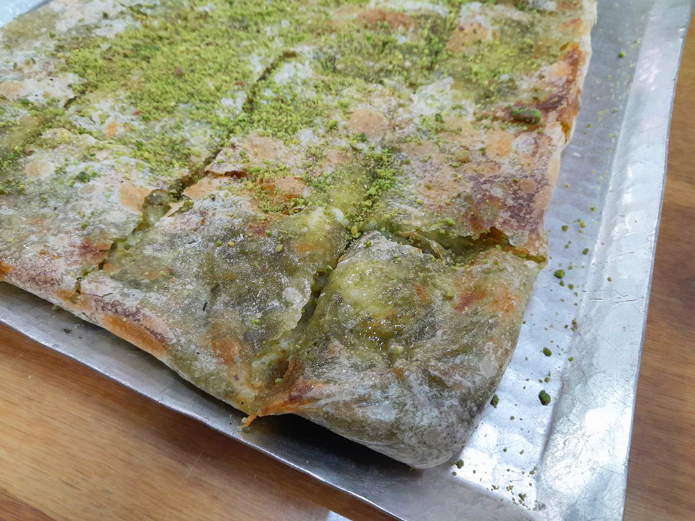 Катмер состоит из тончайшего теста фило, внутри сладкий каймак и молотые антепские зеленые фисташки. Лепешку обжаривают и подают горячей.