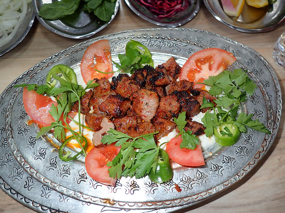 Кусочки баранины-гриль лежат на подушке из йогурта и печёных баклажанов. В качественном варианте вообще не понятно, что там баклажаны, просто какой-то белый и пушистый нежный соус. Само собой, как в любых хороших турецких едальнях, к кебабу подают горячие лепешки, салат и разные мелкие закуски.