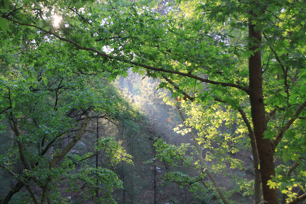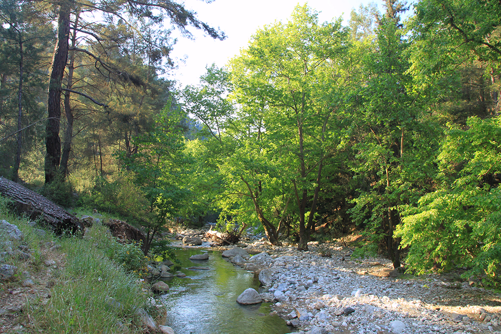 Русло все зеленое, очень красивые старые чинары и утренний солнечный свет в листьях.